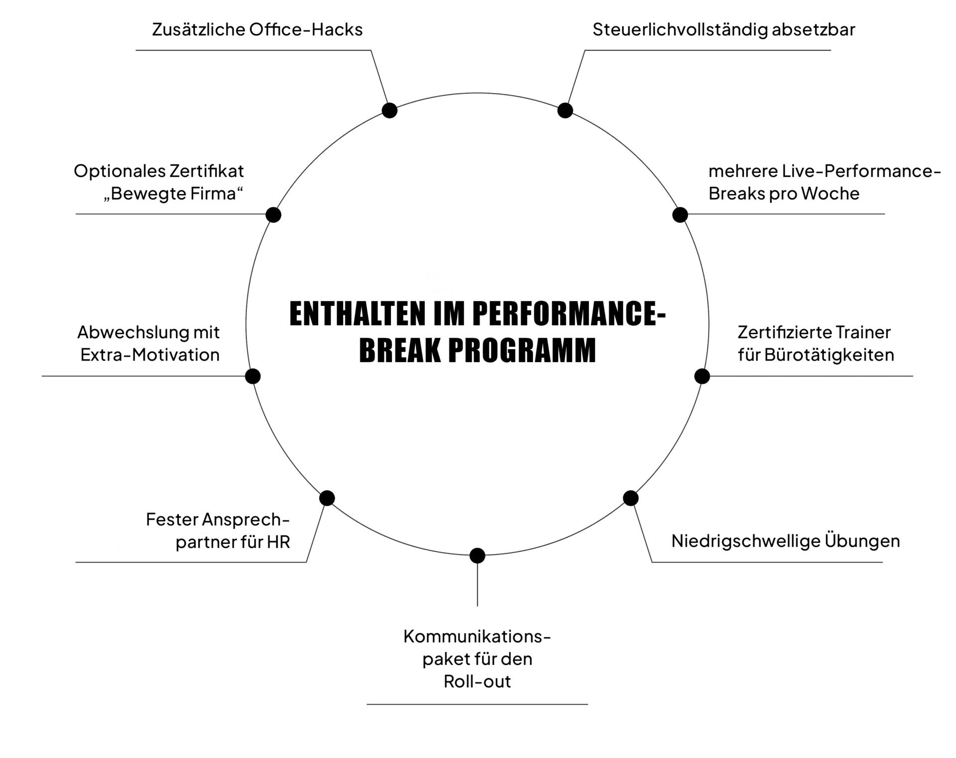 Live-Fitness direkt am Arbeitsplatz für all Ihre Mitarbeitenden: mehrfach wöchentlich, regelmäßig professionelle Performance-Breaks – für mehr Produktivität und bis zu 30% weniger Ausfallzeiten.